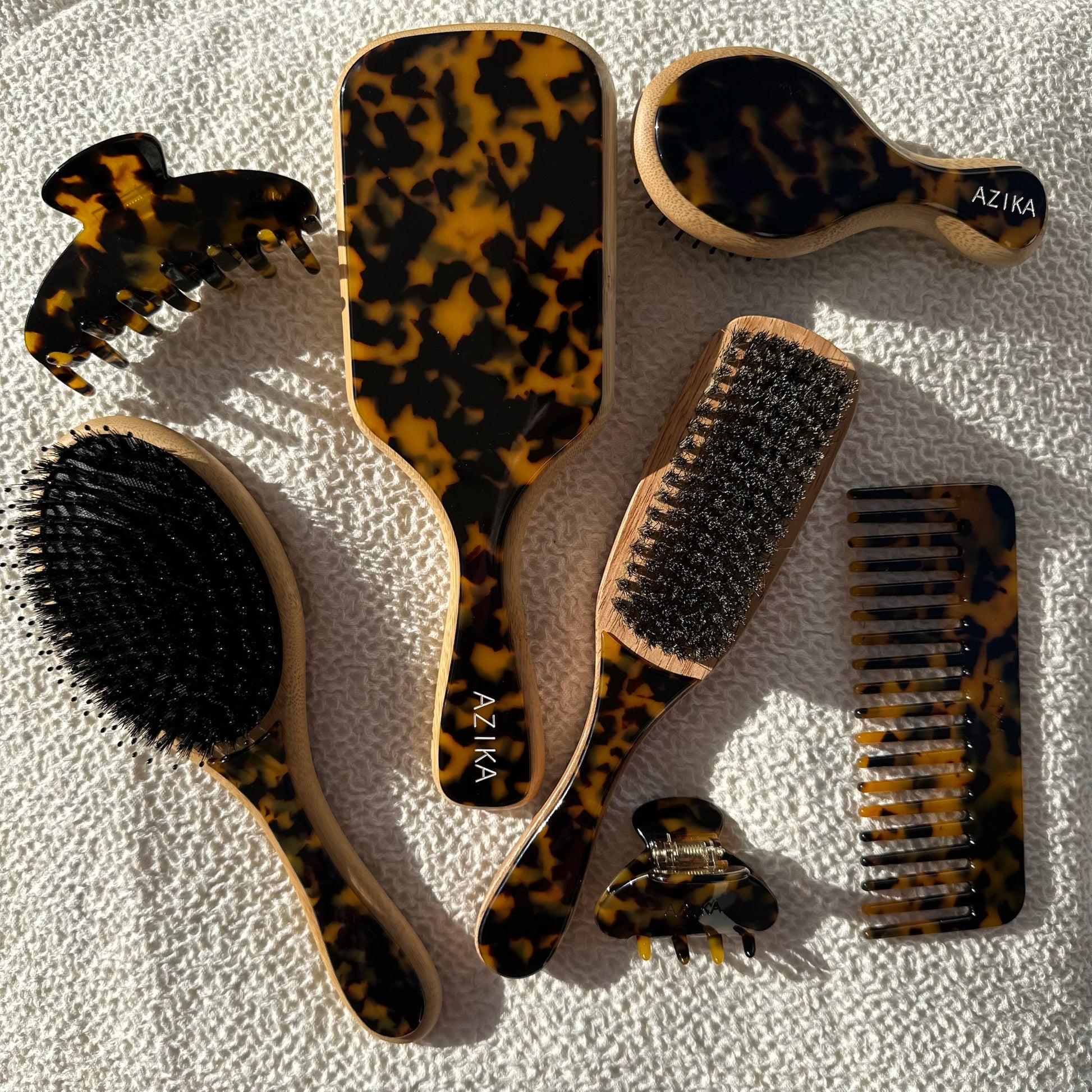 Everything you need in one bundle: our bamboo brush, boar brush, boar & nylon bristle brush, mini brush, big clip, and mini clip. Your complete hair care and styling set designed to look good and feel even better.